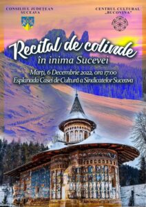 Mâine, 6 decembrie 2022, începând cu ora 17.00, pe Esplanada Casei de Cultură a Sindicatelor din Suceava, de ziua Sfântului Ierarh Nicolae, Ansamblul Artistic Profesionist „Ciprian Porumbescu” al Centrului Cultural „Bucovina”, dar și tineri interpreți invitați, va susține un recital de colinde.