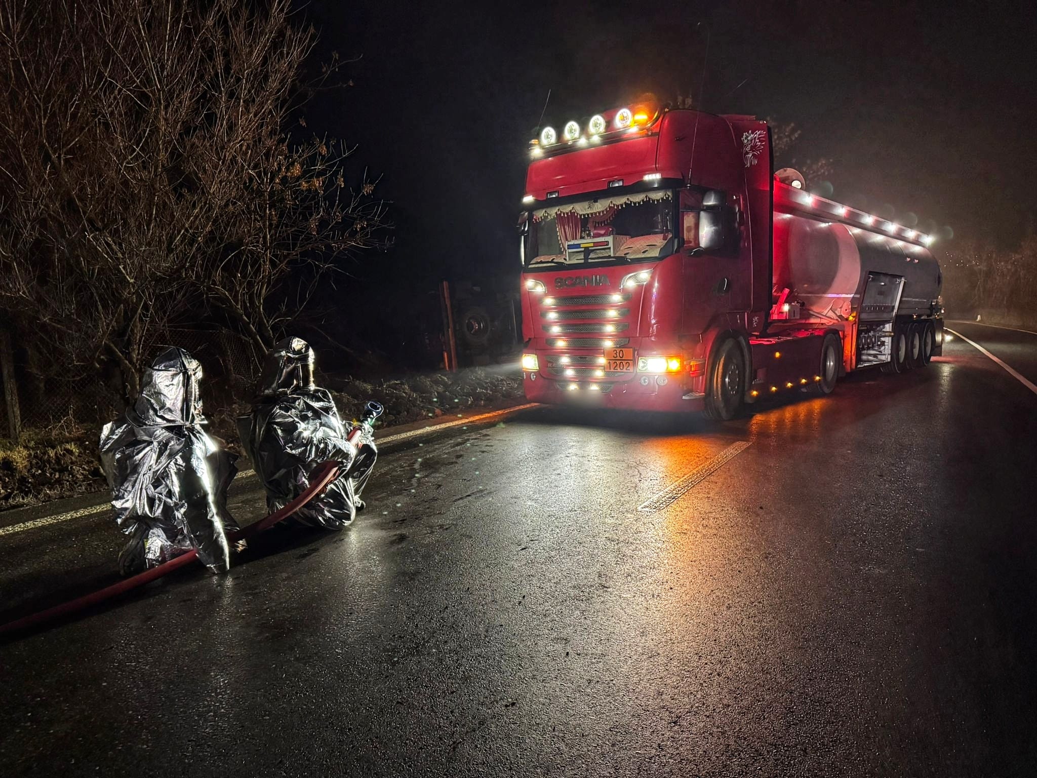 Cisterna este încărcată cu 31.000 de litri de benzină. Au fost scurgeri ușoare, pe care pompierii militari au reușit să le oprească.