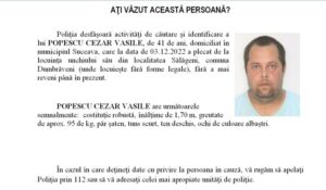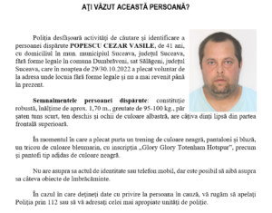 Poza respectivă este cea a lui Cezar Vasile Popescu, un bărbat de 41 de ani, din municipiul Suceava, care a fost dat dispărut în urmă cu trei zile de la locuința unchiului său din satul Sălăgeni, comuna Dumbrăveni, unde locuia fără forme legale.