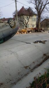 În urma impactului, autoturismul s-a răsturnat, iar din impactul inițiat căruța a lovit un pieton de 58 de ani.