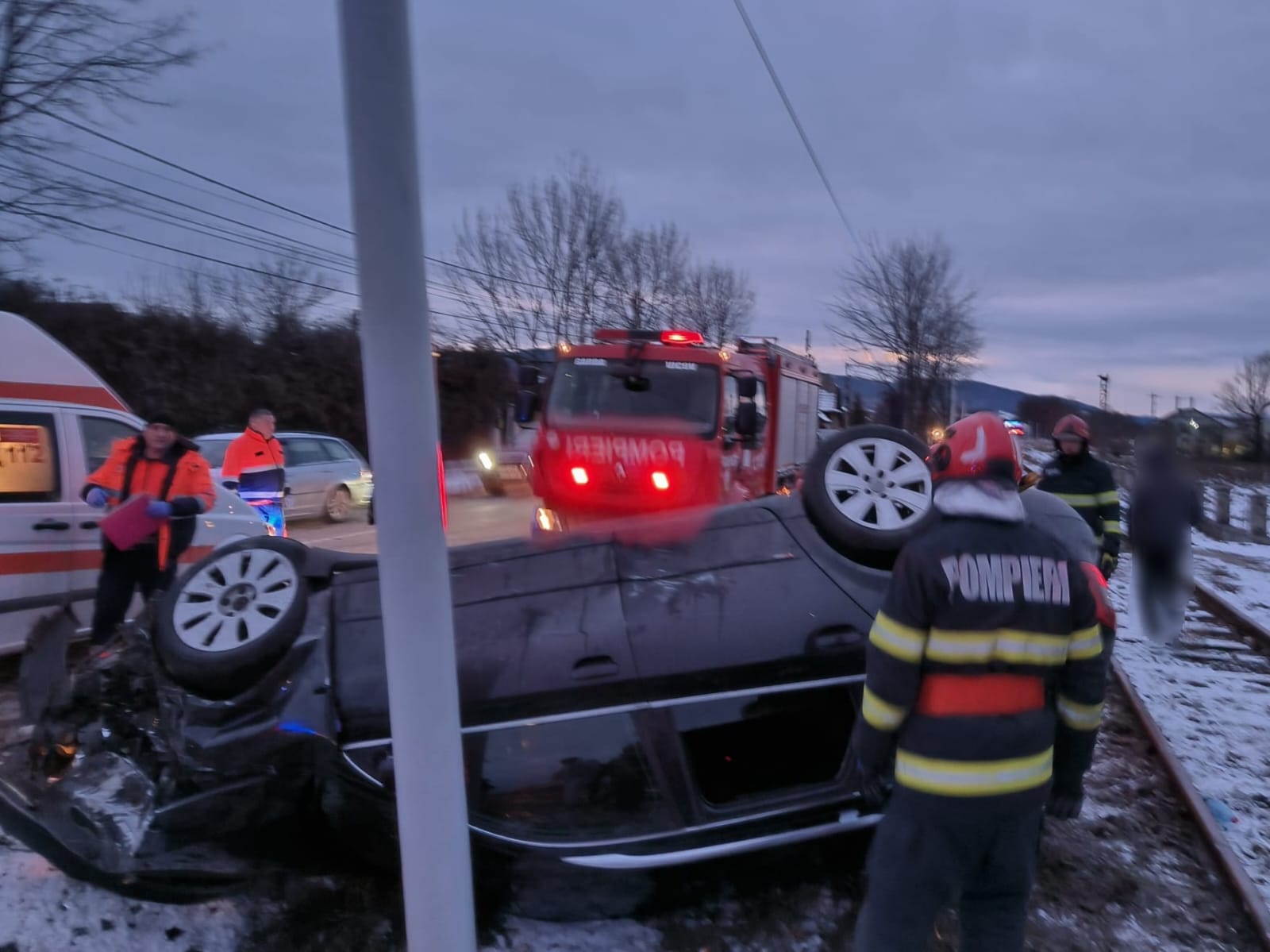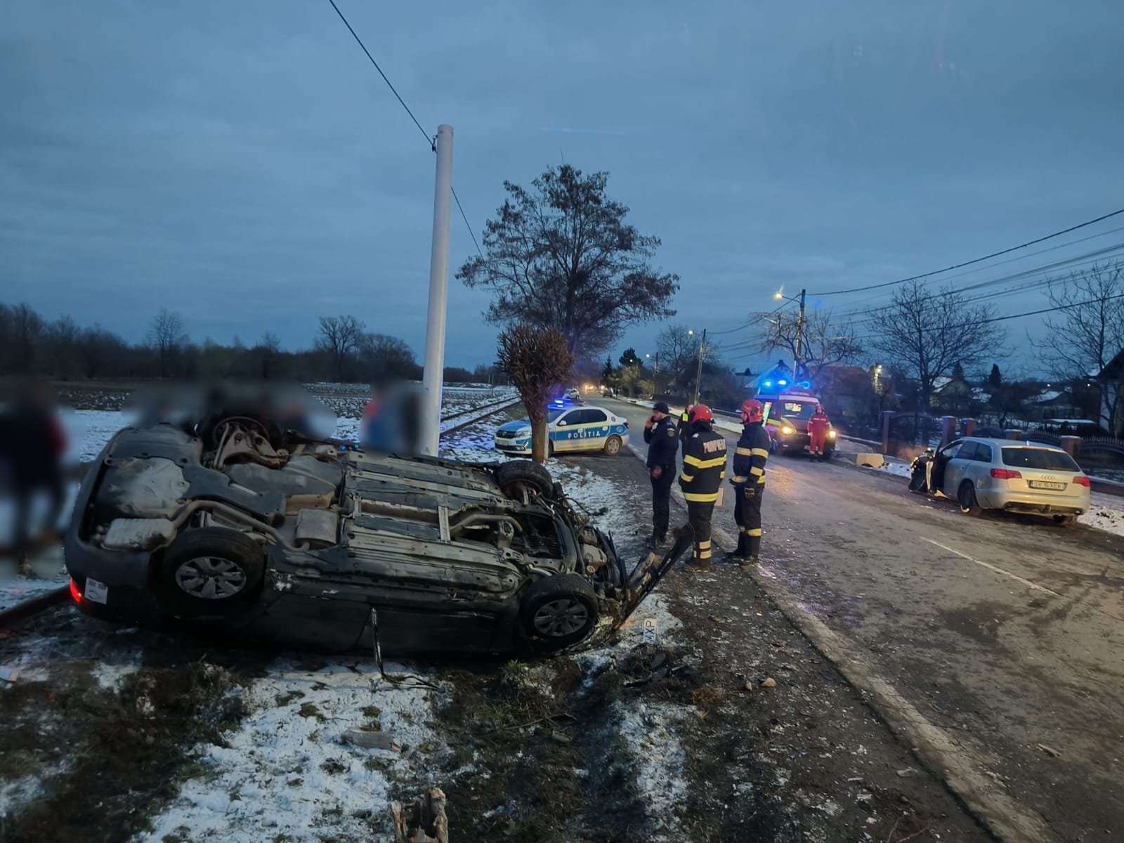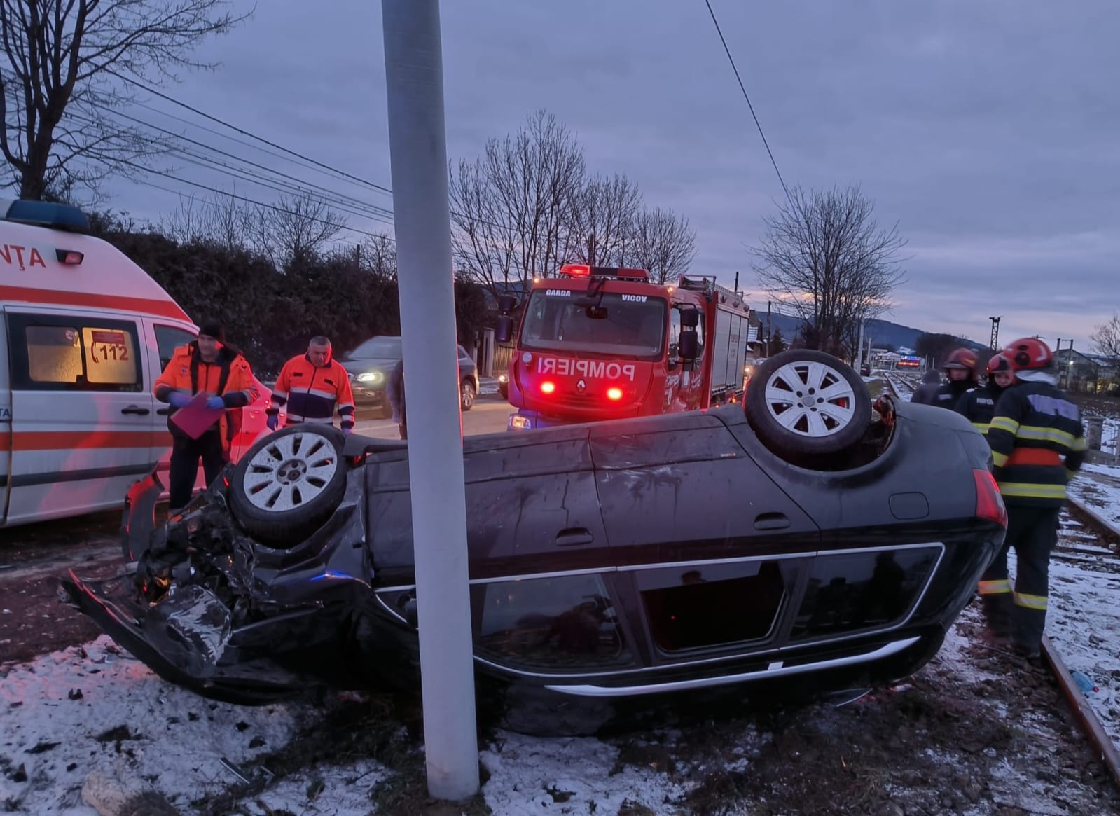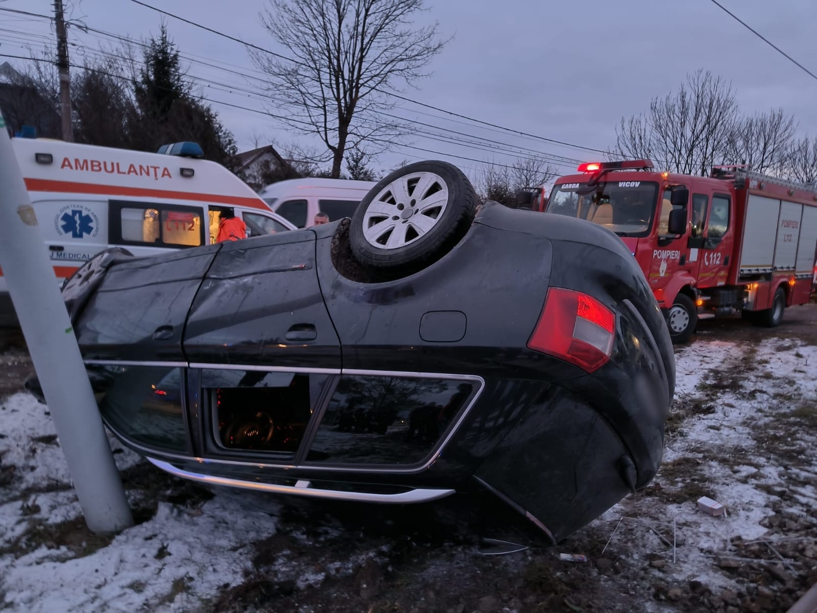 În urma impactului, autoturismul s-a răsturnat pe spațiul verde din partea stângă și s-a oprit pe cupolă, lângă un stâlp din material compozit de susținere a cablurilor electrice.