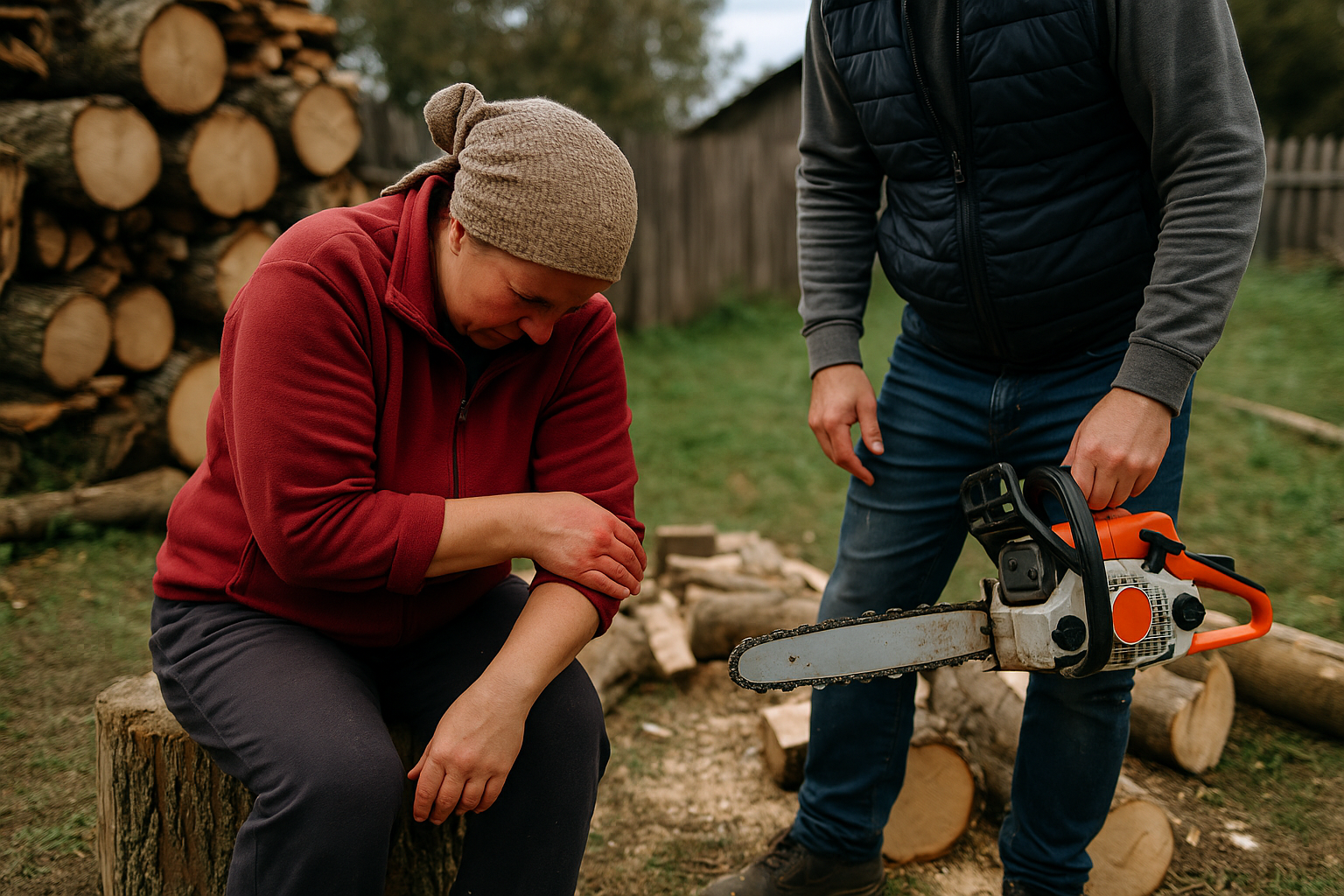 În timp ce acesta manevra drujba, lama a sărit din lemn și a lovit-o femeie, provocându-i leziuni corporale.