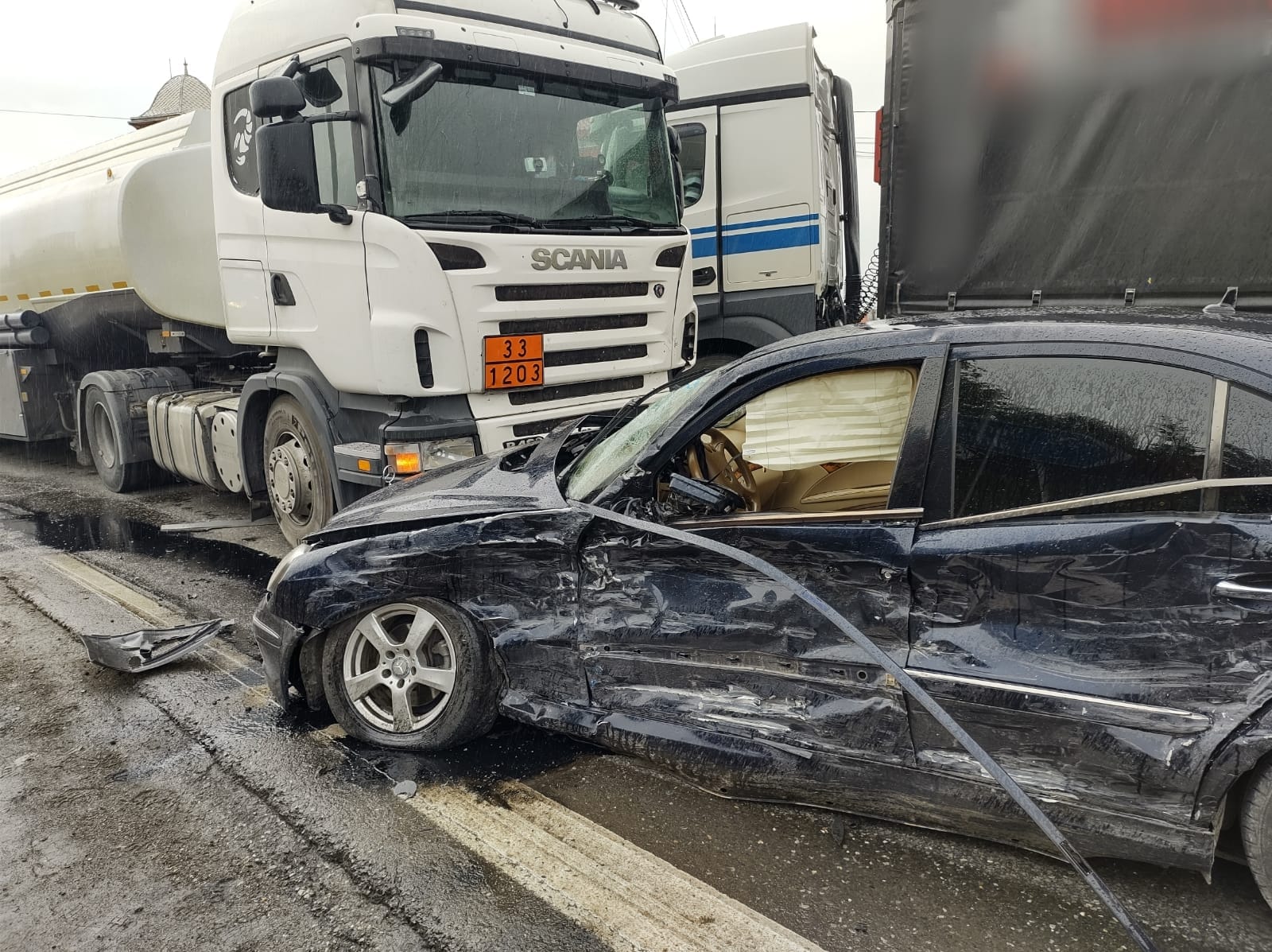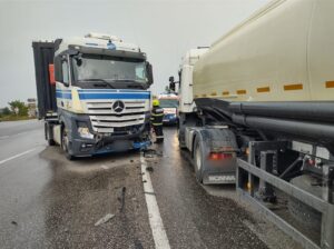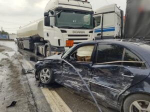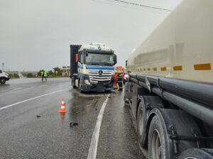 În această dimineață, în jurul orei 10.00, E85 în zona localității Spătărești, a avut loc un accident rutier între două camioane și un autoturism.