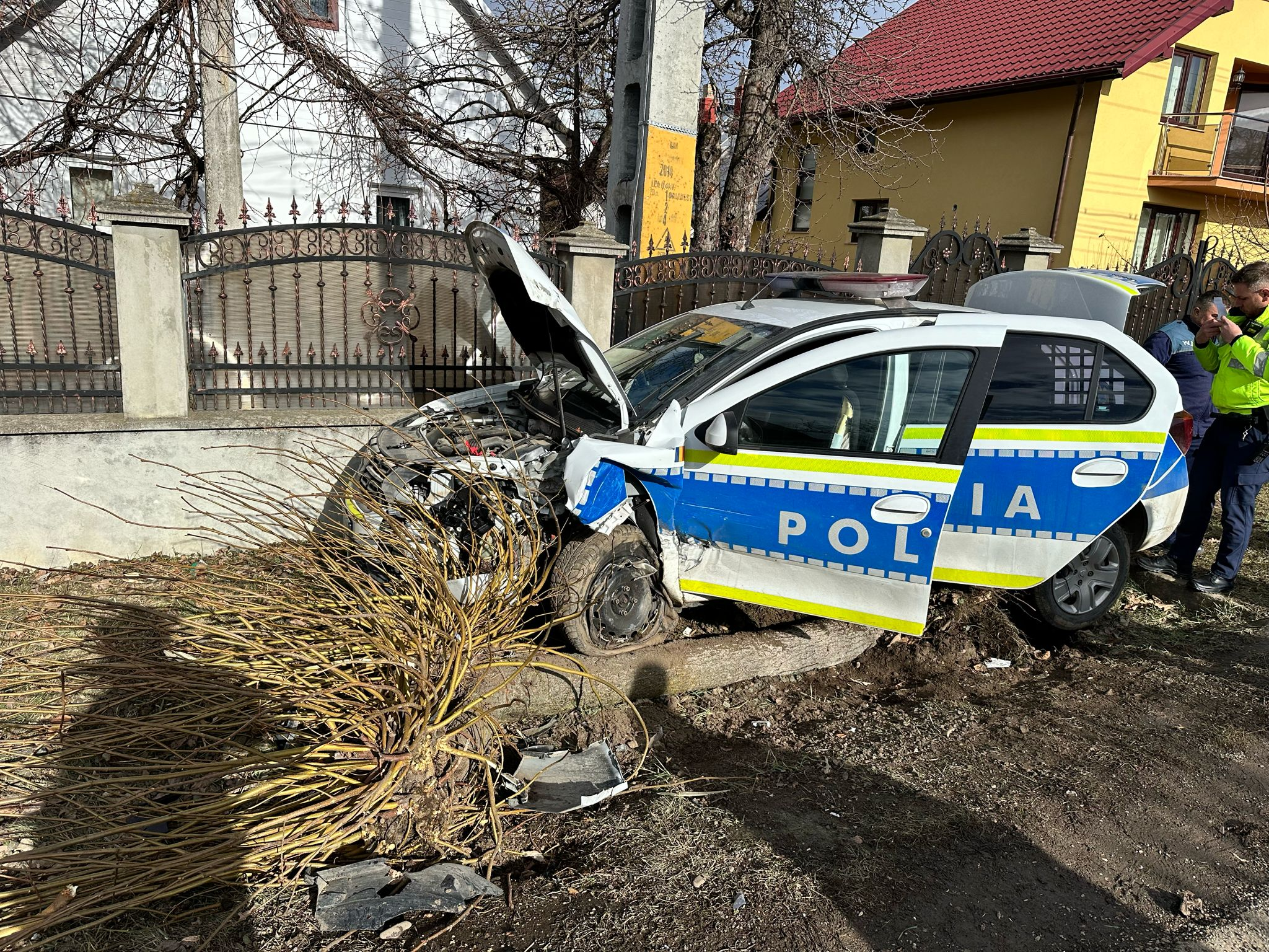 În urma impactului, a rezultat avarierea celor două autoturisme și rănirea ușoară agentului de poliție.