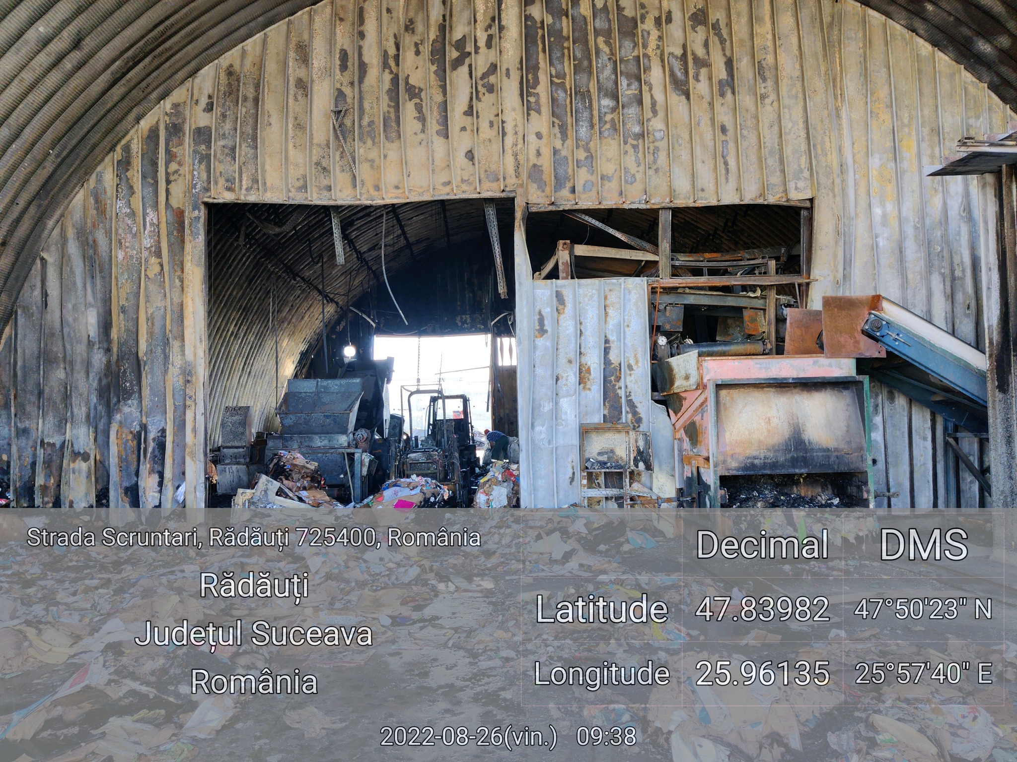 Astăzi, 26 august 2022, în jurul orelor 01.30, s-a produs un incendiu la Stația de sortare și prelucrare mecanică a deșeurilor din mun. Rădăuți, str. Scruntari, fn (administrată prin SERVICII COMUNALE S.A. Rădăuți), în urmă căruia au ars integral și au devenit nefuncționale utilajele și dotările specifice sorțarii deșeurilor reciclabile.