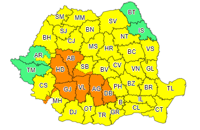 „În intervalul menționat vor fi perioade cu instabilitate atmosferică accentuată în Oltenia, Transilvania, Maramureș, Muntenia, Dobrogea și la munte, cea mai mare parte a Moldovei și local în Crișana și Banat. Vor fi averse torențiale, descărcări electrice, intensificări ale vântului și pe alocuri vijelii și grindină. În intervale scurte de timp sau prin acumulare cantitățile de apă vor depăși 25…30 l/mp și pe arii restrânse 40…50 l/mp”, a transmis ANM.