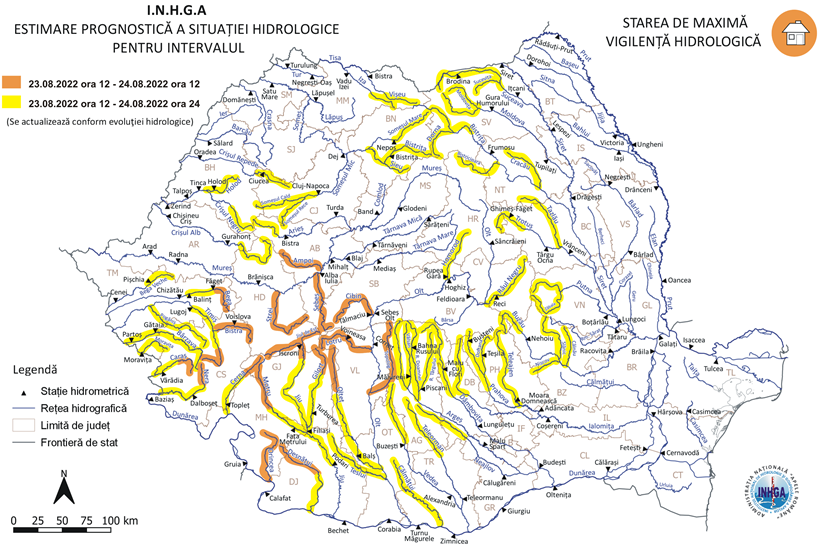 În intervalul 23.08.2022 ora 12:00 – 24.08.2022 ora 24:00 pe râurile din bazinele hidrografice: Vişeu – bazin superior şi afluenţi bazin mijlociu şi inferior, Iza – bazin superior şi afluenţi bazin mijlociu şi inferior (judeţul Maramureş), Someşul Mare – bazin superior şi afluenţi bazin mijlociu şi inferior (judeţul Bistriţa Năsăud), Someşul Mic – bazin superior şi afluenţi bazin mijlociu şi inferior (judeţele: Bihor şi Cluj), Crişul Repede – bazin superior şi afluenţi bazin mijlociu şi inferior (judeţele: Cluj şi Bihor), Crişul Negru – bazin superior şi afluenţi bazin mijlociu şi inferior (judeţele: Bihor şi Arad), Crişul Alb – bazin superior şi afluenţi bazin mijlociu şi inferior (judeţele: Hunedoara şi Arad), Arieş – bazin superior şi afluenţi bazin mijlociu şi inferior (judeţele: Alba şi Cluj), Mureş – afluenţii aferenţi sectorului aval confluenţă cu râul Arieş – amonte confluenţă cu râul Târnava (judeţele: Cluj şi Alba), Mureş – afluenţii aferenţi sectorului aval confluenţă cu râul Târnava (judeţele: Alba, Sibiu, Hunedoara şi Arad), Bega Veche – bazin superior şi afluenţi bazin mijlociu şi inferior, Bega – bazin amonte S.H. Balinţ şi afluenţii aferenţi sectorului aval S.H. Balinţ (judeţele: Timiş şi Arad), Timiş – bazin amonte S.H. Lugoj şi afluenţii aferenţi sectorului aval S.H. Lugoj, Bârzava, Moraviţa (judeţele: Caraş Severin şi Timiş), Caraş, Nera (judeţul Caraş Severin), Cerna (judeţele: Gorj şi Caraş Severin), Dunăre – afluenţii mici aferenţi sectorului amonte confluenţă cu râul Desnăţui (judeţele: Caraş Severin, Mehedinţi şi Dolj), Desnăţui (judeţele: Mehedinţi şi Dolj), Jiu – bazin amonte S.H. Podari şi afluenţii aferenţi sectorului aval S.H. Podari (judeţele: Hunedoara, Gorj, Mehedinţi şi Dolj), Râul Negru (judeţele: Harghita, Covasna şi Braşov), Olt – afluenţii aferenţi sectorului aval S.H. Hoghiz (judeţele: Braşov, Harghita, Sibiu, Vâlcea, Argeş, Gorj, Dolj şi Olt), Călmăţui (judeţele: Olt şi Teleorman), Vedea – bazin superior şi afluenţi bazin mijlociu şi inferior (judeţele: Argeş, Olt şi Teleorman), Argeş – bazin superior şi afluenţi bazin mijlociu şi inferior (judeţele: Argeş, Dâmboviţa, Giurgiu, Teleorman şi Ilfov), Ialomiţa – bazin amonte S.H. Târgovişte şi afluenţii aferenţi sectorului aval S.H. Târgovişte – amonte S.H. Siliştea Snagovului (judeţele: Dâmboviţa, Prahova şi Ilfov), Prahova – bazin superior şi afluenţi bazin mijlociu şi inferior (judeţele: Prahova şi Ialomiţa), Buzău – bazin amonte Ac. Siriu şi afluenţii aferenţi sectorului aval Ac. Siriu – amonte S.H. Baniţa (judeţele: Braşov, Covasna, Buzău şi Prahova), Putna – bazin superior şi afluenţi bazin mijlociu şi inferior (judeţul Vrancea), Trotuş – bazin superior şi afluenţi bazin mijlociu şi inferior (judeţele: Bacău, Neamţ, Harghita, Covasna şi Vrancea), Bistriţa – bazin superior şi afluenţi bazin mijlociu şi inferior (judeţele: Suceava, Neamţ, Harghita şi Bacău), Moldova – bazin superior şi afluenţi bazin mijlociu şi inferior (judeţele: Suceava şi Neamţ), Suceava – bazin superior şi afluenţi bazin mijlociu şi inferior (judeţul Suceava).