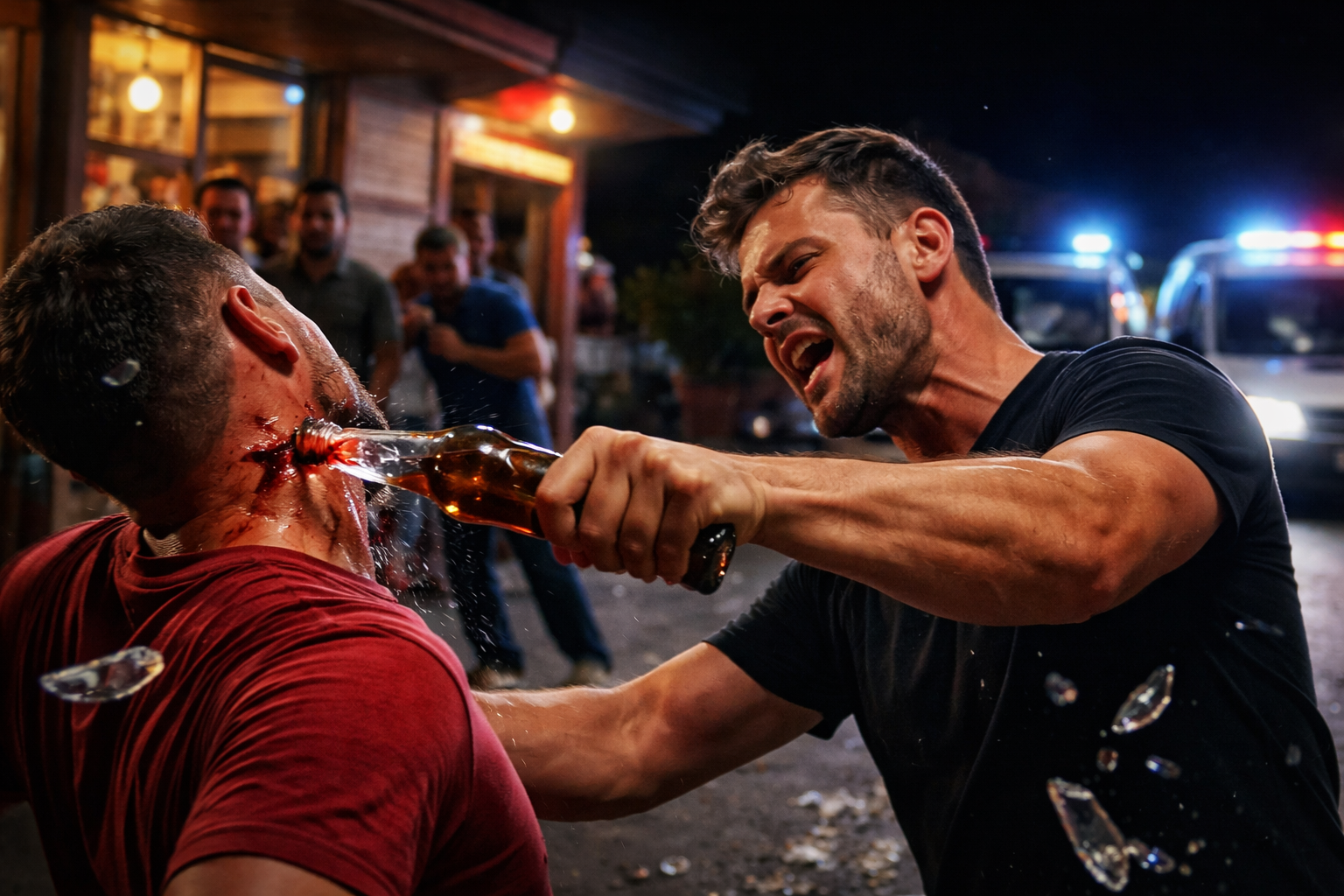 Audiat ca persoană vătămată, unul dintre bărbați a declarat că se afla pe terasa unui bar, unde consumase mai multe sticle de bere, iar la un moment dat a apărut celălalt, care i-ar fi adresat injurii și amenințări. A mai spus că, după ce au ieșit în stradă, a fost lovit o singură dată în zona gâtului cu un ”gât de sticlă”, iar apoi, speriat, i-a aplicat adversarului mai mulți pumni în zona feței, până când acesta a căzut.