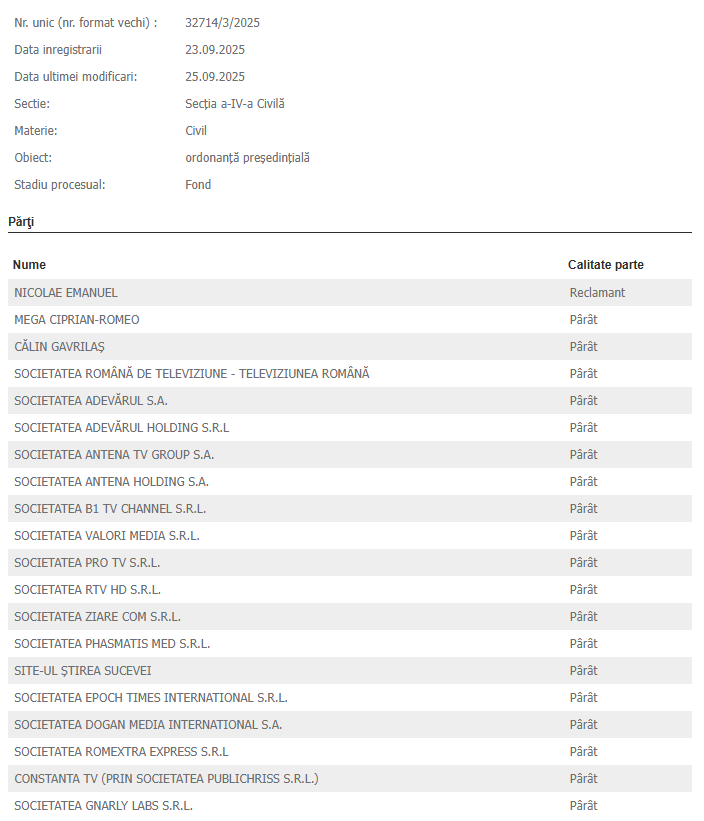 Aceste informații false au fost preluate şi distribuite succesiv de toate pârâtele pe toate mijloacele de comunicare în masă, în presa scrisă în on-line, audiovizual şi pe conturile deținute pe rețelele de socializare şi pe canalele de YouTube. Practic, prin toate mijloacele de distribuire a informațiilor, aceste acuzații grave au fost preluate şi distribuite ca şi cum ar fi fapte reale, veritabile ştiri, deşi reprezintă simple acuzații defăimătoare făcute de pârâtul Ciprian-Romeo Mega.