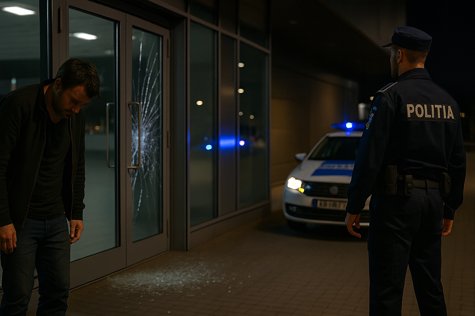 Bărbatul le-a declarat polițiștilor că, supărat din cauza pierderii unei sume mari de bani la jocurile de noroc, a ieșit afară și, într-un moment de furie, a aruncat cu un pahar din sticlă în geamul de la intrarea în complexul comercial, spărgându-l.