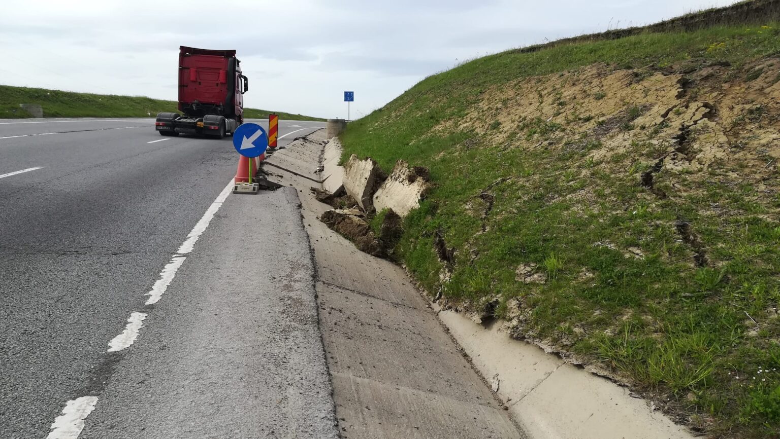 Săptămâna trecută, pământul a luat-o la vale pe varianta ocolitoare a municipiului Suceava. Mai exact, taluzul s-a surpat pe o suprafață de aproximativ 320 mp, angrenând distrugerea șanțului pavat pe o lungime de 25 de metri și înaintarea spre acostament cu 0,7 metri.