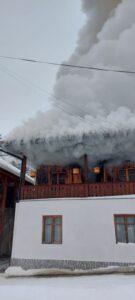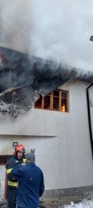 Incendiul s-a manifestat la interiorul acoperișului, cu degajări mari de fum.