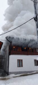 Au ars etajul și acoperișul unui depozit de obiecte bisericești, construcție din lemn, cu învelitoare din tablă, pe o suprafață de aproximativ 250 mp.