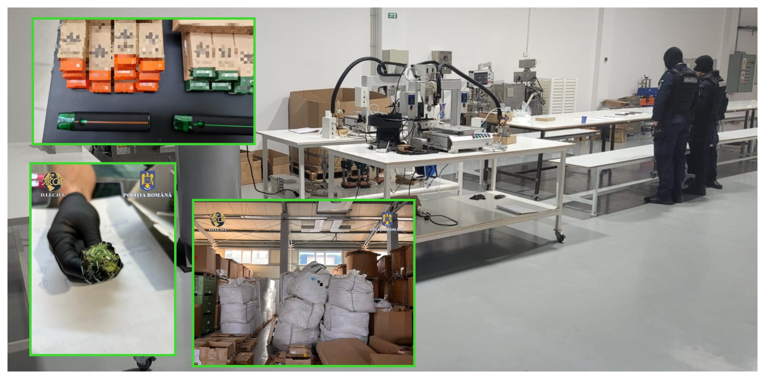 De asemenea, s-a stabilit că în perioada octombrie 2022 – septembrie 2023, membrii grupului infracțional au produs în vederea comercializării peste 100.000 de dispozitive tip VAPE care conțineau substanțe care produc efecte psihoactive ( HHC, HHC-P, HHC-O, H4CBD, THC-P) de natură a pune în pericol viața persoanelor care le consumă.