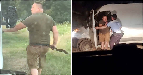 Un individ înarmat cu o sabie a atacat mai multe familii care se aflau la un picnic în marginea pădurii. Agresorul a lovit cu sabia geamul unui autoturism, iar cioburile s-au împrăștiat pe bancheta din spate, unde se aflau copii, a tamponat mașini și i-a amenințat cu moartea. Nici măcar polițiștii n-au fost în stare să-l liniștească pe agresor.